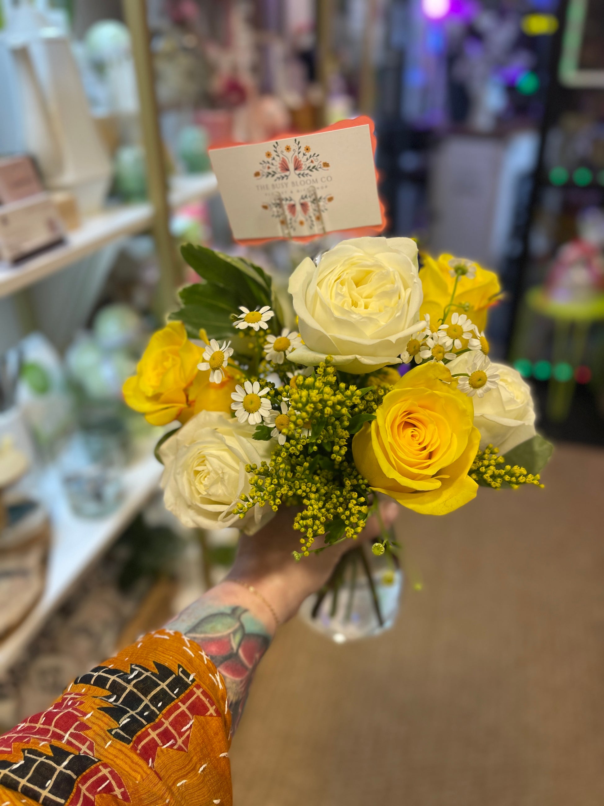 Bring a little bit of sunshine into someone's life with our small yellow and white arrangement! Perfect for brightening up any space and expressing gratitude. Made with care and sure to bring a smile to anyone's face.